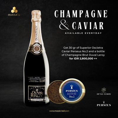 Experience a touch of luxury with Mozaic's exclusive Champagne & Caviar special for only IDR 2,800,000++. Indulge in a bottle of exquisite Brut Duval-Leroy Champagne paired with 30 grams of superior Oscietra Caviar Perseus No.2. This elegant combination promises a delightful unique experience, blending the crisp, refined bubbles of the champagne with the rich, luxurious flavors of the caviar. Treat yourself to a lavish escape and savor these premium delicacies at Mozaic. This special is available every day.